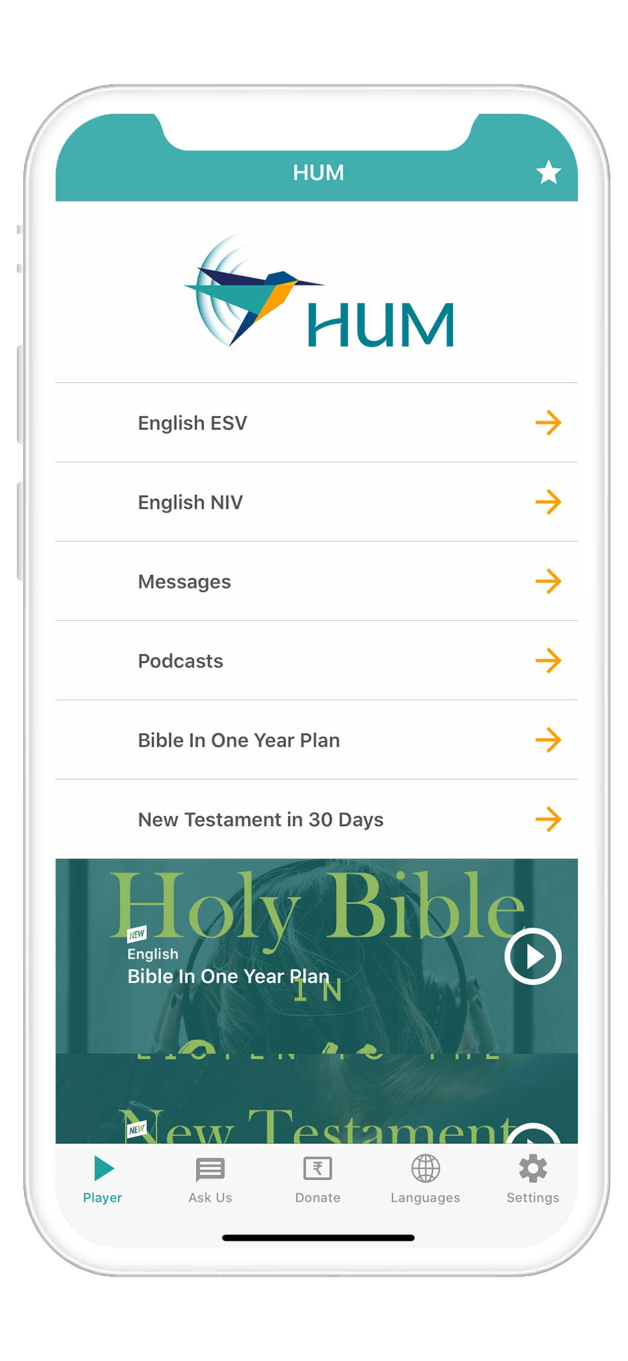 HUM is a new free Audio Bible App that brings God’s message to your mobile device, providing The Holy Bible in audio in your heart language. HUM was designed with oral-preference learners in mind, providing easy navigation for everyone, whether you’re able to read or not.